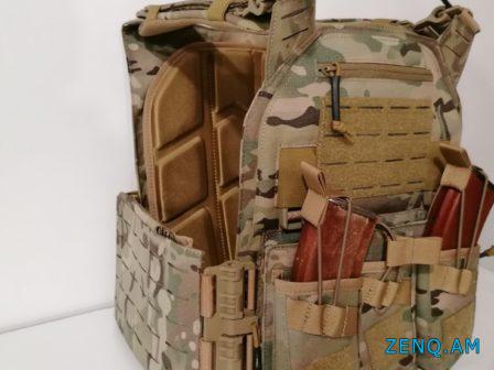 Զրահակիր (плитаноска)(առանց քարերի) , կտորը` 1000D նեյլոն, գույնը `մուլտիկամ, Moll համակարգ, արագ հանվող համակարգ, մեջը ամորտիզացիայով, 3 բաց մագազինի տեղով, կողքերին գրպաներ,դեմը փակվող գրպան, չափսը `կարգավորվող,